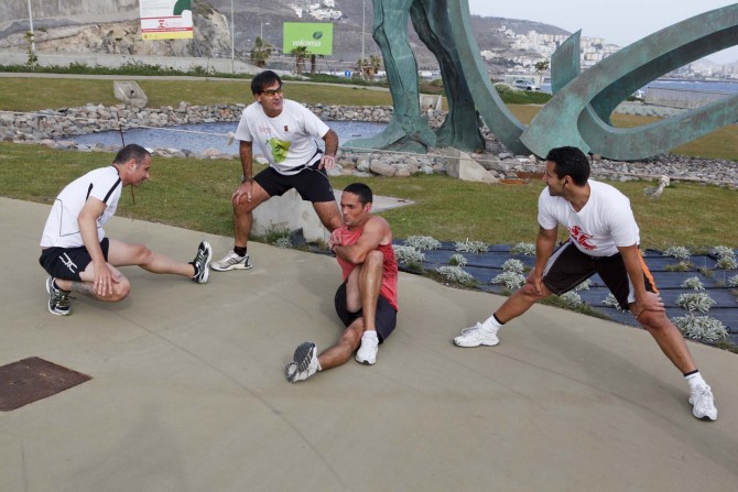 Un educador del Salto del Negro, José María Izquierdo; dos monitores deportivos, uno por cada centro, Santiago López y Cándido Martín, y la responsable de ayudar a los corredores a realizar ejercicios de tonificación y puesta a punto en los gimnasios, Marina Martín, acompañan a los internos en estas salidas.