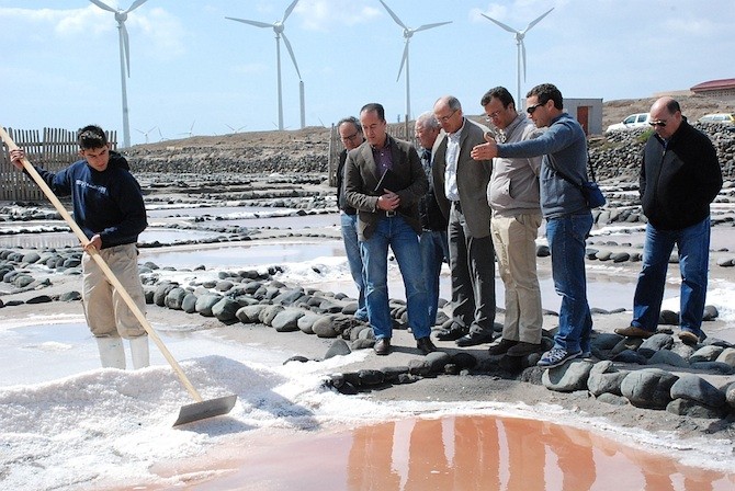El alcalde Silverio Matos acompañó al consejero a conocer las Salinas de Tenefé, en Pozo Izquierdo, también declaradas Bien de Interés Cultural. Álvarez había mostrado interés en conocer estas salinas, construidas en barro y que datan de finales del siglo XVIII, así como el proyecto que se desarrolla en ellas, una escuela taller en la que más de una veintena de jóvenes trabajan en la recuperación del saladar y en la regeneración de los tajos, a la vez que se forman como nuevos maestros salineros.