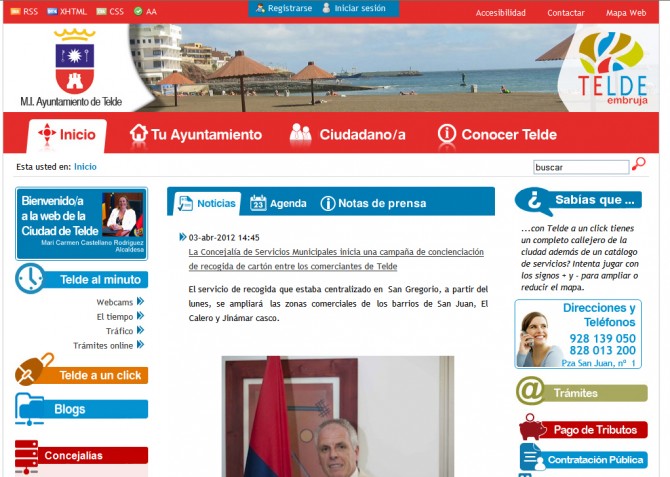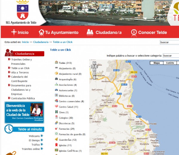 Lo primero es entrar el www.telde.es, puerta de acceso a la Web oficial, no por ella la más interesante para los no teldenses ni, probablemente, la más visitada. En la columna de la izquierda, o siniestra, seleccionar con el ratón la opción “Telde a un click”.