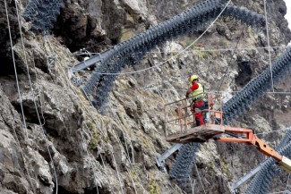 Rodríguez, acompañado de los concejales del ayuntamiento de La Aldea, recorrió junto al presidente y el consejero de Obras Públicas, los diferentes trabajos que se están realizando en la instalación de la malla de protección para evitar los desprendimientos sobre la vía.