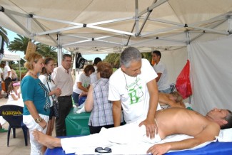 En ese sentido, el alcalde prestó especial atención a distintos stands, entre ellos el de Radio Ecca, con información sobre todos los cursos que ofrece durante el año vinculados a la rama de la salud; y sobre todo a las clases prácticas magistrales que impartia en directo la veterana exmasajista de 73 años Begoña Ferrero, cuya escuela de masajes y terapias alternativas colaboró con este evento aportando 20 alumnos que ofrecieron sus manos y conocimientos a todos aquellos vecinos que quisieron disfrutar gratuitamente de sesiones de estiramiento o de masajes reparadores y relajantes.