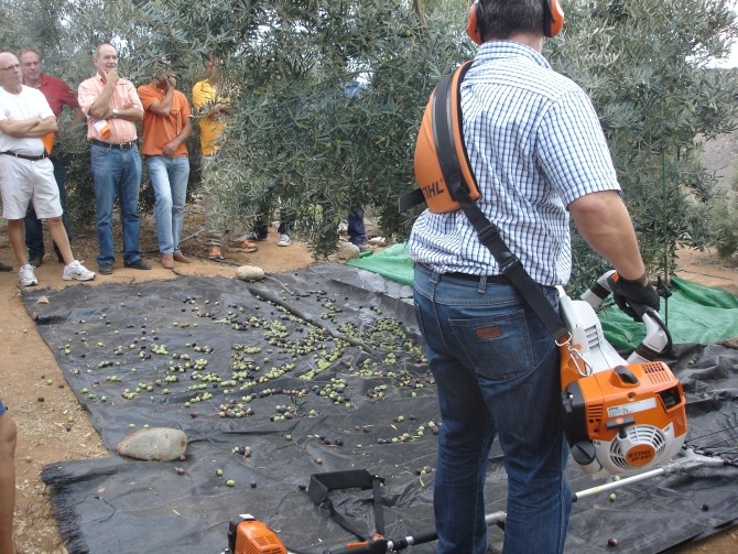 En la demostración se utilizaron máquinas vibradoras diferentes. Éstas ofrecen un mayor rendimiento a la hora de la recolección, por su capacidad de hacerlo de forma más intensiva y con mayor rapidez.