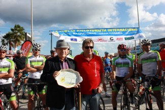 Damián Armas Clemente, cicloturista de La Palma, que ya participara en la edición de 1991, el italiano Franco Magli, con un maillot conmemorativo que recuerda sus 20 participaciones consecutivas en la Vuelta.