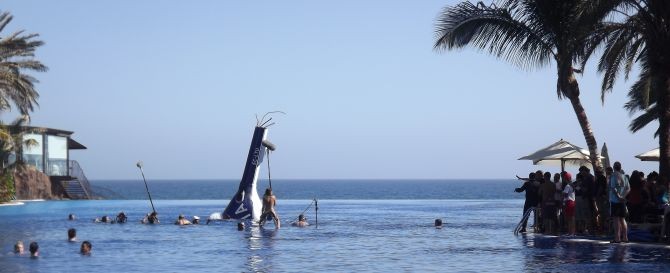 La piscina Infinity Pool fue el lugar escogido para la que será una de las últimas escenas de acción de esta producción, en la que los protagonistas, interpretados por Luis Tosar, Eduard Fernández y Juan Motilla, sufren un accidente de helicóptero.  Dos de ellos logran sobrevivir y salen a la superficie del “mar” rodeados de restos de helicóptero. Para la recreación de esta escena, el equipo de efectos especiales creó una maqueta de la cola del helicóptero, a tamaño real,  y la colocó en el fondo de la piscina. Durante cuatro horas intensas de trabajo, el personal del hotel estuvo a disposición de las necesidades del equipo técnico y de los actores.