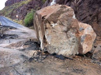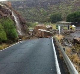 Las piedras cayeron en la intersección donde comienza la carretera a los Palmitos Park y causó daños importantes en el asfalto, el acceso ha quedado cortado desde la GC-503 y para acceder a Palmitos Park habrá que hacerlo desde El Tablero y a Montaña la Data Alta, desde Montaña la Data baja.