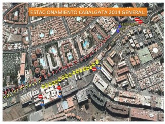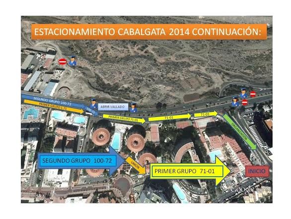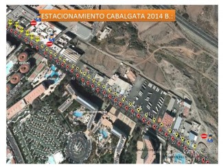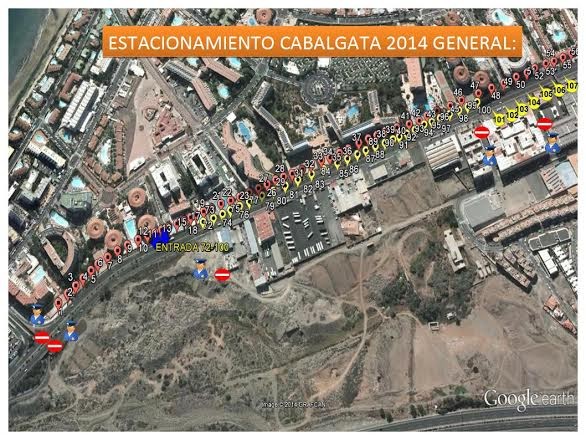 Las carrozas podrán estacionar una vez finalizado el itinerario en la explanada del Mercado Municipal de San Fernando de Maspalomas. El aparcamiento previo y lugar de concentración al inicio de la cabalgata estará situado en la carretera GC-500 (antigua autopista del sur).