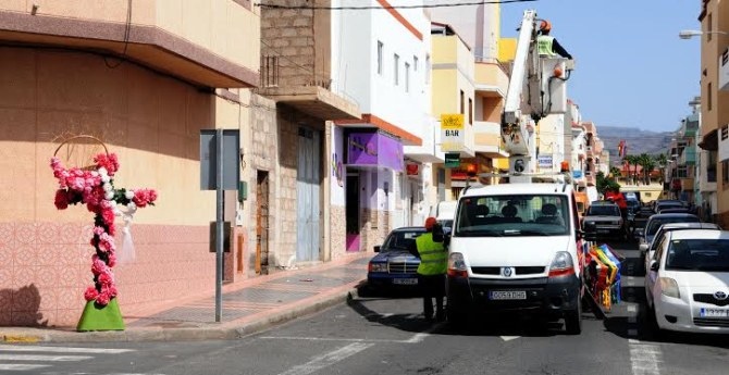 Durante la mañana de este viernes, operarios de la Concejalía de Servicios Municipales adornaban las calles que atravesarán los numerosos romeros, ya adornadas con anterioridad por los vecinos con cruces florales.