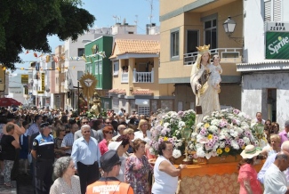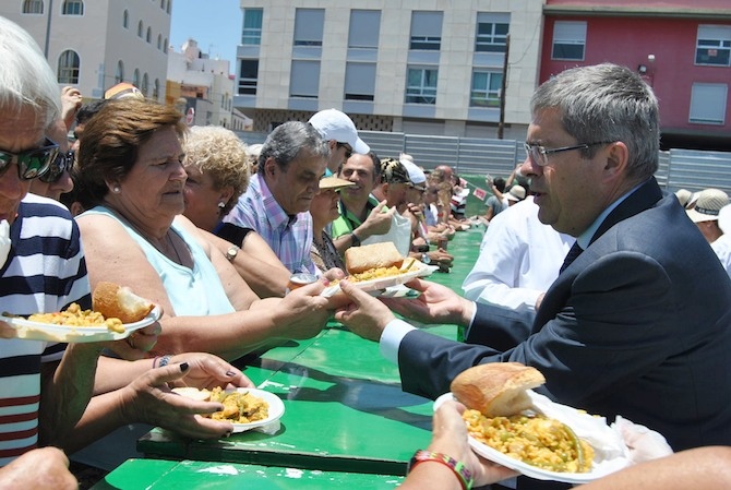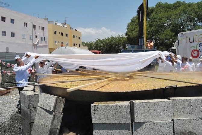 Sobre las 12:30 horas, el cocinero jefe del Hotel Parque Cristóbal, José Luis Navarro, ordenó el arrojo de los numerosos ingredientes dentro de la paellera, elaborada en 1990 con hierro y acero, con un diámetro de 5 metros y 22 centímetros de alto. A esa misma hora se iniciaba por las principales calles del pueblo, Venezuela, Puerto Rico, Brasil y Avenida de Las Américas, la procesión de los iconos de la Virgen del Carmen y de la patrona Santísima Trinidad, acompañadas por centenares de parroquianos que avanzaron al ritmo marcado por los cinco componentes de la Banda Guanche. El párroco la había convocado “en silencio”, como “un ejemplo evangelizador de los vecinos” y como “una muestra catequista de fe en la trinidad del Padre, del Hijo y del Espíritu”.
