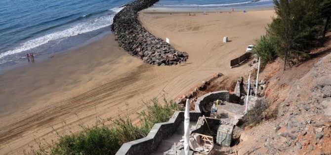 La escalera, que salva un gran desnivel entre la plataforma de la urbanización de Playa del Inglés y las playas, finalizará sobre la arena con un entarimado de madera ecotecnológica equipado con varios puntos de lavapies.