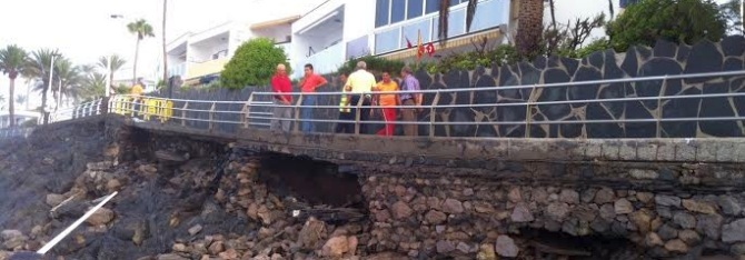 El temporal marítimo con olas de hasta cinco metros que está afectando estos días al litoral canario ha provocado el agrietamiento de unos 15 metros a lo largo del muro que sustenta el Paseo Costa Canaria entre las Playas de San Agustín y Puerto Chico, en Las Burras.