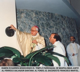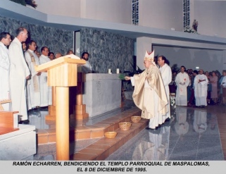 El 8 de diciembre de 1995, Monseñor Ramón Echarren marca un hito trascendente, cuando inaugura un amplio y luminoso Templo Parroquial en Maspalomas, en acto litúrgico concelebrado por 25 sacerdotes. El Párroco de la época, el Rvdo. Don Salvador Santana, me encomendó la tarea de intervenir en la solemne ceremonia en nombre de los maspalomeros e hiciera una síntesis de hechos, anécdotas y citas históricas en homenaje a todas las personas (laicos y seglares) que dedicaron parte de su vida al servicio de la Parroquia y su gente.