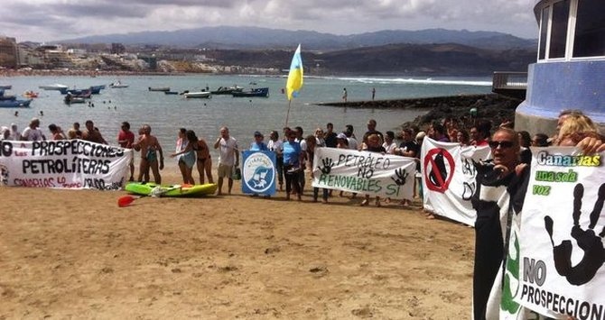 Los colectivos contrarios a las prospecciones petrolíferas autorizadas por el Gobierno central a Repsol han protagonizado este domingo una nueva protesta en la playa de Las Canteras de Las Palmas de Gran Canaria donde han informado a los periodistas de que, en caso de que el Gobierno no tenga en cuenta a estos movimientos ciudadanos, no apoyarán la consulta que pretende lanzar el Ejecutivo de Paulino Rivero para preguntar a la población canaria su opinión sobre los sondeos.