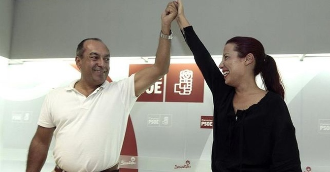 Fotografía: El secretario de Organización del PSC-PSOE, Julio Cruz (i), y la ganadora e las primarias que ha celebrado el partido en Canarias, Patricia Hernández, se saludan tras dar a conocer los resultados de las elecciones. EFE/Ramón de la Rocha