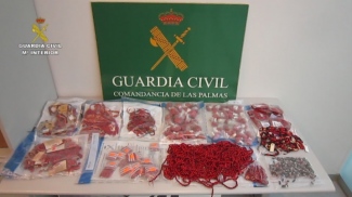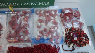 La Guardia Civil intervino 184 colgantes, 63 collares, 100 pulseras y 10 rosarios elaboradas con semillas de abrina, así como otras 5.525 semillas para la fabricación de bisutería.