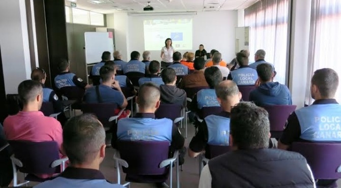 Miembros de la Policía Local y Protección Civil de Santa Lucía, Guardia Civil y Cruz Roja han participado este jueves en las oficinas municipales de Vecindario en un curso de prevención contra la aparición de serpientes y otras especies exóticas invasivas, que se está dando en otros municipios de la Isla con la serpiente real de California (Lampropeltis getula californiae).