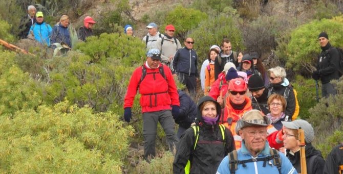 La caminata por las laderas del Barranco Grande y El Fondillo de Tejeda se desarrolló sin contratiempos, con algo de sorimba tenue y una intermitente y ligera brisa perfumada de tierra de montaña, velada en todo su recorrido por una cuadrilla de monitores especializados del área de Deportes y otra de Cruz Roja.