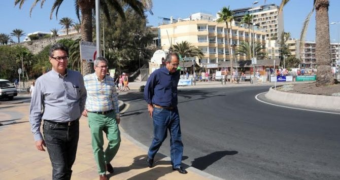 El director general de Infraestructura Turística, Miguel Cabrera, acompañado por el alcalde, Marco Aurelio Pérez, y el concejal de Servicios y Ordenación del Territorio, Fernando González, giraron una visita a diversos lugares de las obras que se ejecutan en la zona turística
