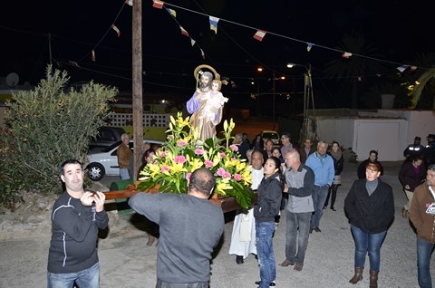 Los actos festivos arrancaron con la celebración de una misa canaria oficiada en el salón de la antigua escuela unitaria y sede vecinal por el párroco de la zona, Paco García Socorro, y con la posterior procesión colectiva de la imagen enramada del santo a hombros de los vecinos por las calles del barrio.