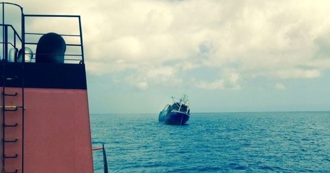 Desde que fue arrastrado fuera del puerto a alta mar, a una zona segura, el "Oleg Naydenov" ha estado acompañado por un remolcador de Salvamento Marítimo, el "Punta Salinas".
