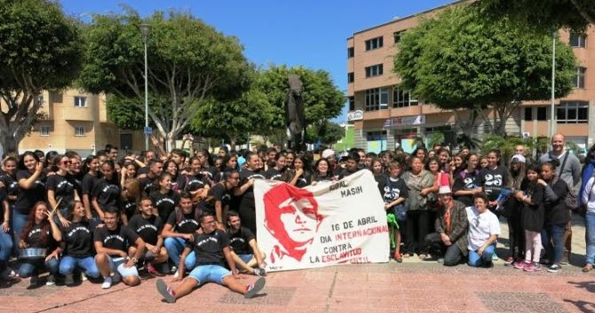 Una batucada sirvió como apertura del evento, que continuó con la lectura de un manifiesto que reclamaba “romper cadenas en la búsqueda de la justicia y exigir a Naciones Unidas y a la Organización Internacional del Trabajo que se tomen las medidas necesarias encaminadas a la abolición efectiva de la esclavitud infantil, y solicitando al los gobiernos de España y de Canarias, y a la Comunidad Europea del estudio de aplicaciones de medidas necesarias para garantizar en las relaciones comerciales con otros países que los productos que se importen no sean elaborados por mano de obra infantil”. Tras el homenaje, el grupo de estudiantes se dirigió al Teatro Municipal Víctor Jara para asistir al concierto didáctico del dúo Per-QT.