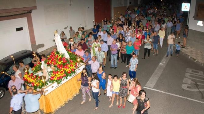 Con la iglesia a rebosar, un grupo rociero de Las Palmas de Gran Canaria se encargó de cantar los pasajes de la Misa ante varios centenares de fieles veneradores de la imagen de la patrona de Aldea Blanca. La afluencia aumentó con los incorporados al posterior recorrido de la imagen de la Virgen de Fátima por las calles, mientras los fervorosos acompañantes portaban antorchas en torno a la talla de la patrona.