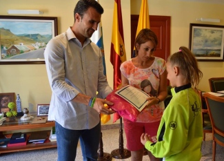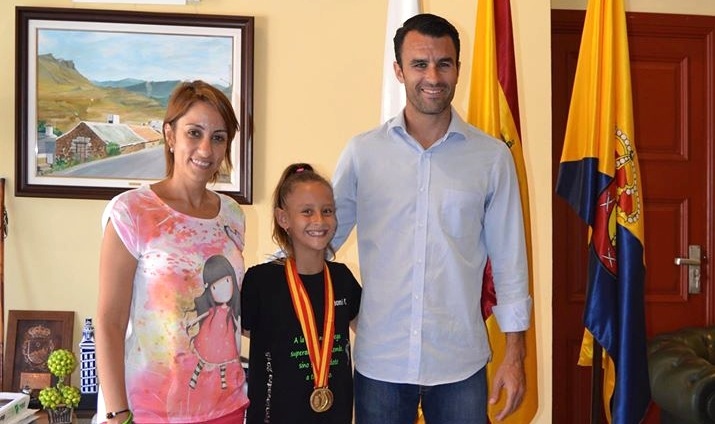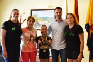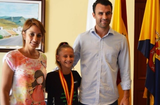 La alcaldesa de Mogán, Onalia Bueno, y el concejal de Deportes, Luis Miguel Becerra, recibieron este miércoles a la moganera Naomi Cabrera, recién proclamada campeona de España de Gimnasia Rítmica.