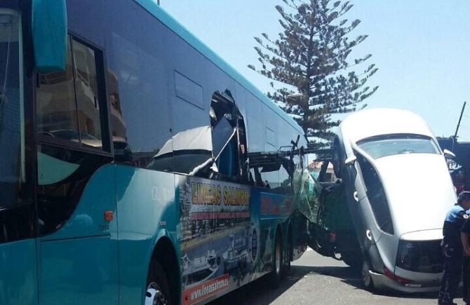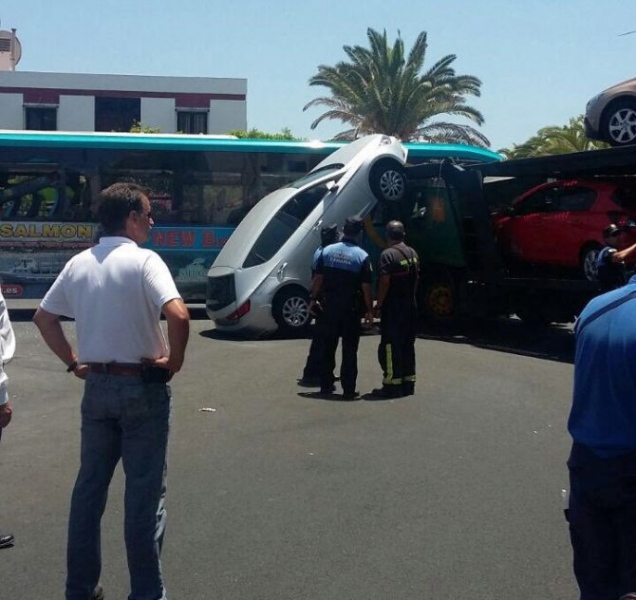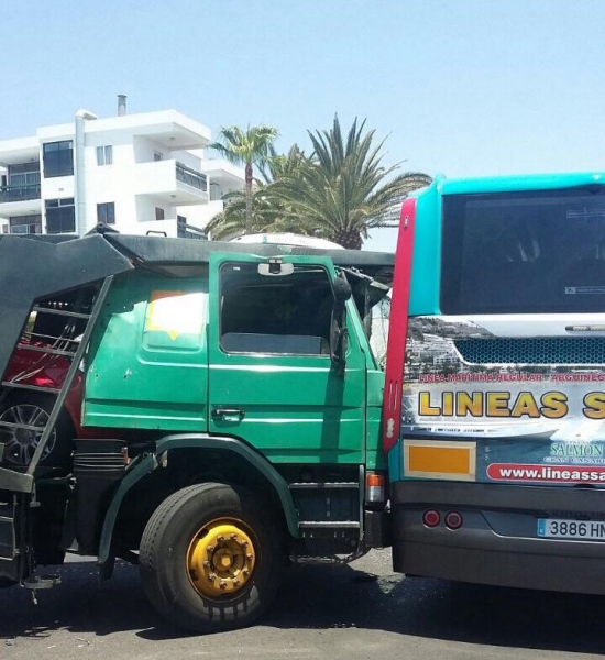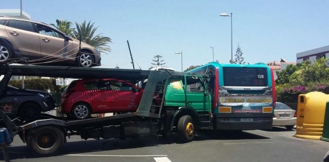 El accidente se produjo este martes pasado el mediodía, en la Avenida de Madrid de la zona turística de Maspalomas. El camión portacoches chocó contra la guagua, que produjo la caída de al menos uno de los vehículos que transportaba.