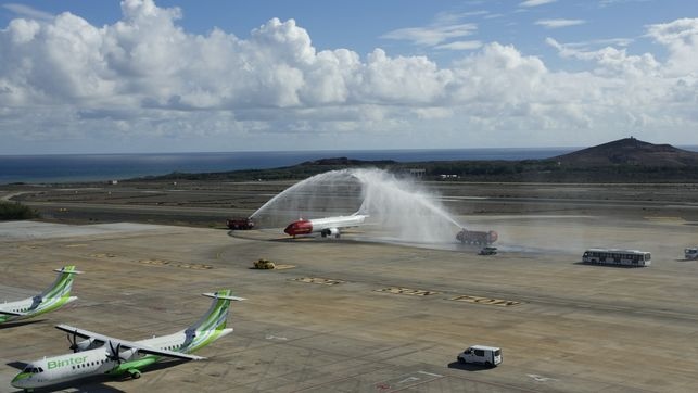 Para recibir este avión, el cuerpo de bomberos del Aeropuerto de Gran Canaria formó un arco de agua para dar así la bienvenida. Además, los pasajeros fueron agasajados con una tarta conmemorativa y recibidos por las autoridades a su llegada a la terminal.