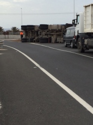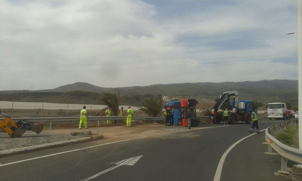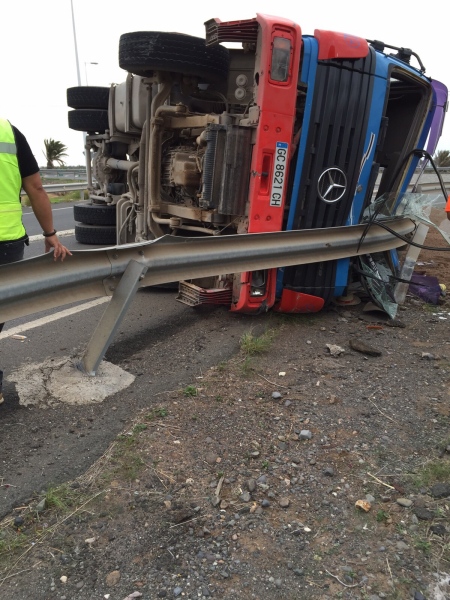 Un camión volcó y se salió de la vía durante la mañana de este miércoles en la carretera GC-500, a la altura del acceso al vertedero de Juan Grande.