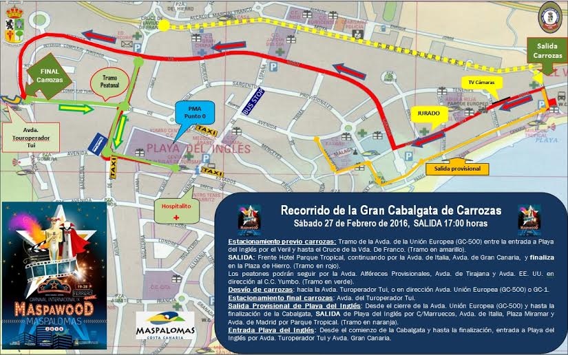 La Gran Cabalgata, que iniciará a las 17:00 horas, tendrá un año más su salida frente el Hotel Parque Tropical, continuando por la Avenida de Italia, Avenida de Gran Canaria y finalización en la Avenida de Turoperador Tui.