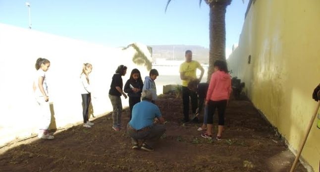 Los escolares, que plantaron hortalizas y algunas flores ornamentales que tendrán que cuidar para ver crecer, pusieron como nombre al huerto ‘El Rincón de Paquito’, y también asistieron a una exhibición de poda de palmeras por parte de técnicos del Almacén Municipal.