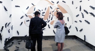 A dúo, Rocío Álvarez y Laura Cabrera sorprenden y atrapan al público con su instalación ‘Inercia’, una especie de hormiguero gigante en el que sustancian el concepto gregario base de la exposición, realizado en técnica mixta, con cerámica esmaltada, metal y cartón.