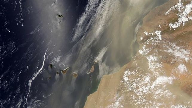 Esa imagen, tomada por uno los instrumentos de "Aqua", el Espectrómetro de Imágenes de Resolución Moderada (MODIS), muestra a Canarias y a gran parte del océano cubiertos por un velo de polvo.