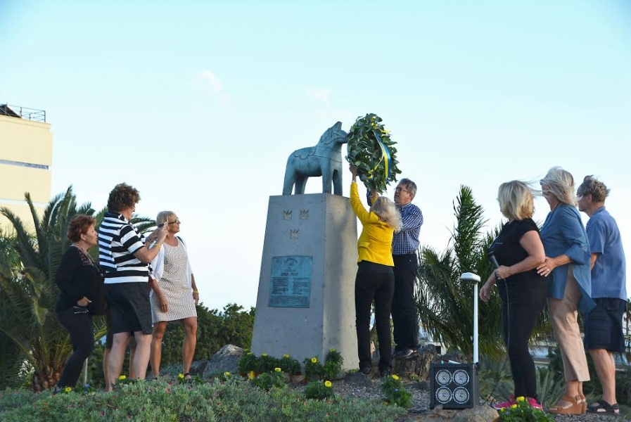 Organizado por las llamadas ‘madrinas’ de la asociación sueca, el sencillo y breve festejo de homenaje al ‘caballo Dalahäteri’ consistió en una reseña pública sobre el icono esculpido en bronce por la artista sueca de origen húngaro y residente en Tenerife, Marta von Poroszlay, y en la colocación de una corona de laurel y flores en la escultura.