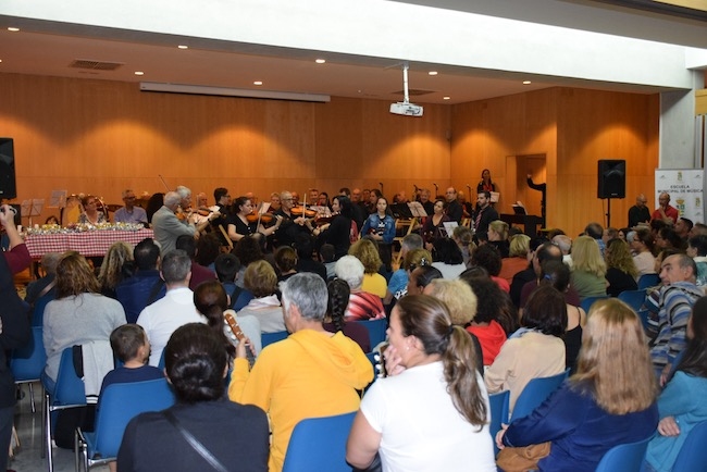 El concierto, en el que participaron todos los profesores y alrededor de un centenar de alumnos representantes de todas las aulas formativas de la Escuela de Música, generó una numerosa expectación, y volvió a tener como en ediciones anteriores carácter gratuito y un objetivo solidario, para abastecimiento del banco de alimentos que coordina en este municipio la Asociación benéfica Elomar.