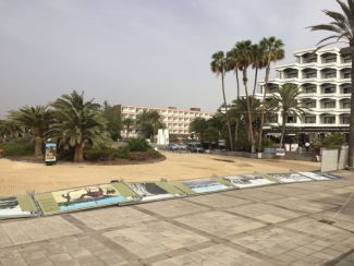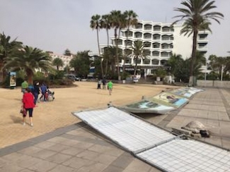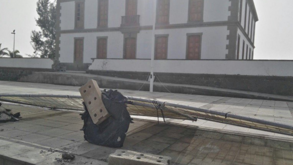 Las fuertes rachas de viento que se han registrado en el sur de la isla han causado entre sus efectos, la caída de los paneles informativos que recorrían todo el perímetro de las paralizadas obras de El Faro de Maspalomas. Al menos hasta este domingo permanecían en el suelo en uno de los lugares más simbólicos de la zona turística, como podemos ver en estas fotos publicada por UxGC.