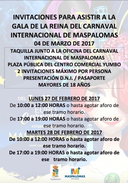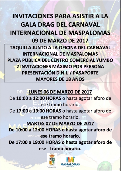 La Organización del Carnaval Internacional de Maspalomas repartirá, un año más, invitaciones para sus Galas de la Reina y Drag Queen 2017, para lo que ha establecido dos días y dos turnos horarios de distribución, para cada una de ellas.