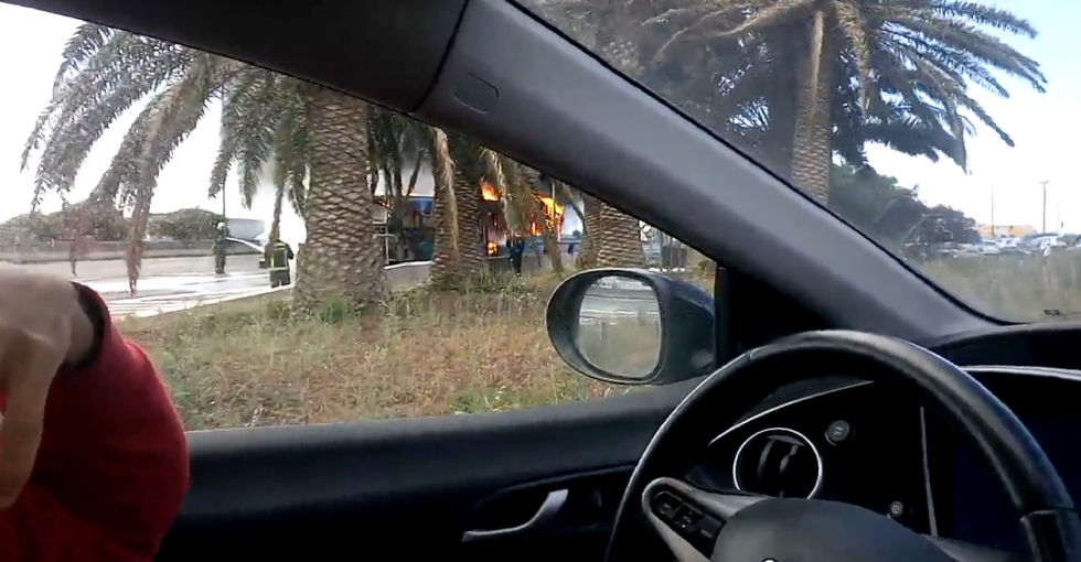 Una guagua de la empresa Global arde en las GC 1, en dirección sur frente al municipio de Telde, en las inmediaciones del aeropuerto de Gran Canaria