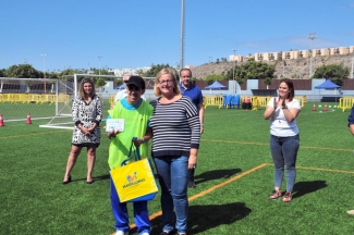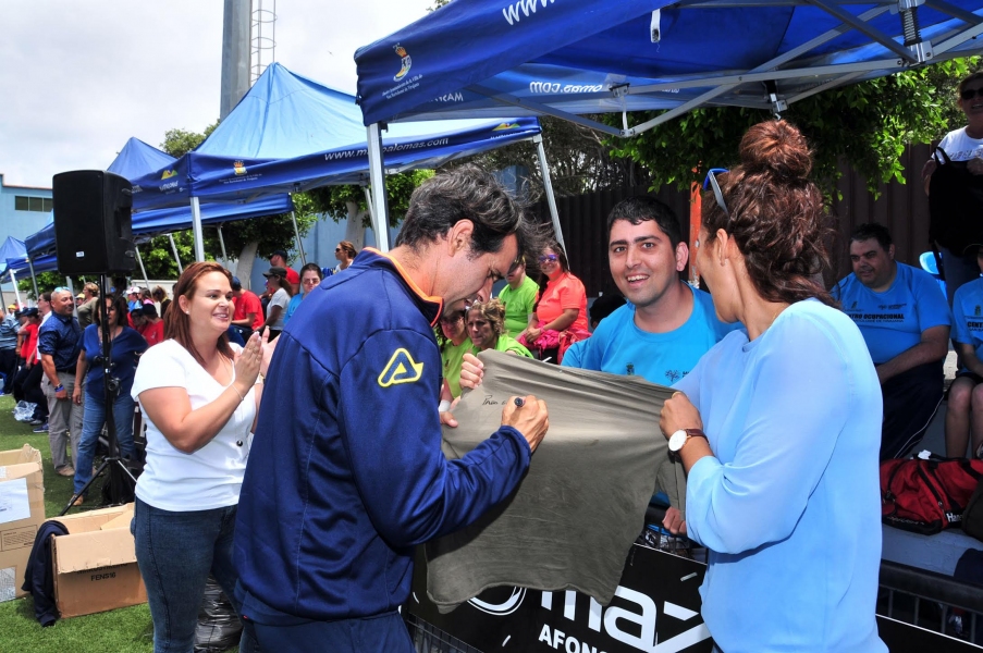 El momento más ilusionante para los usuarios llegó al final de la mañana, cuando Juan Carlos Valerón se acercó al campo para participar de la jornada y colaborar en la entrega final de trofeos a los equipos ganadores.