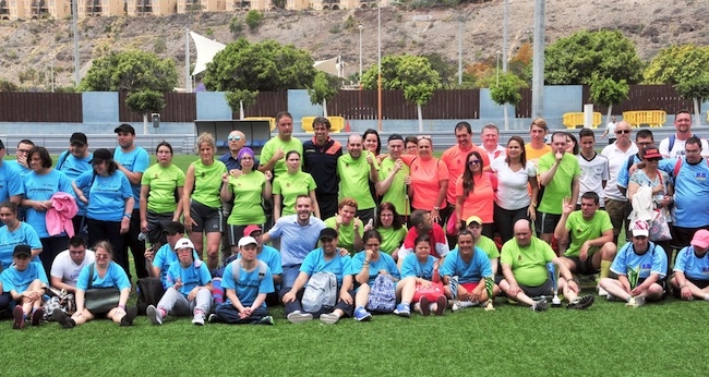 El I Encuentro de Fútbol 7 para usuarios de centros ocupaciones de Gran Canaria hizo que la jornada de este viernes fuera totalmente distinta en el campo de fútbol número 1 de la Ciudad Deportiva Maspalomas. Casi trescientos participantes de nueve centros de atención a personas con alguna discapacidad participaron en una jornada lúdico-deportiva de normalización e inclusión.