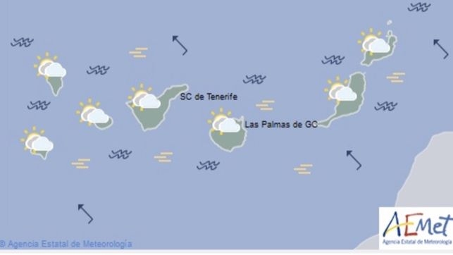 Nuboso de nubes medias y altas. Calima. Temperaturas en ligero ascenso. En costas, viento variable flojo, con predominio de las brisas. En medianías y cumbres, viento del sur moderado