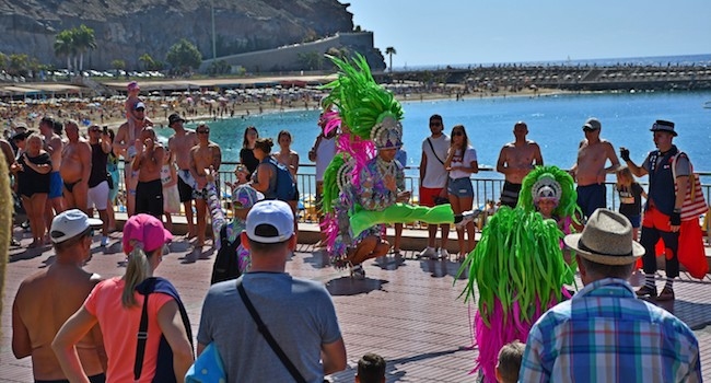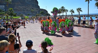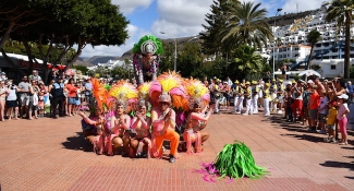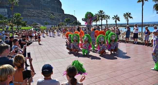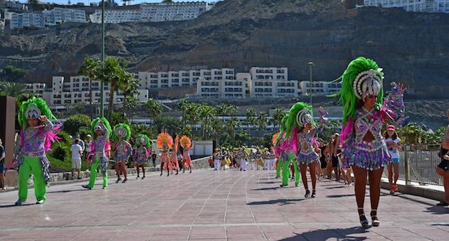 Los tambores con ritmo brasileño de la batucada Samba Da Ihla acercaron sobre las 11:30 horas a turistas y curiosos al paseo junto a la playa de Amadores, donde la comparsa Aragüimé encabezaba el pasacalles con sus colorido vestuario y una animada coreografía.