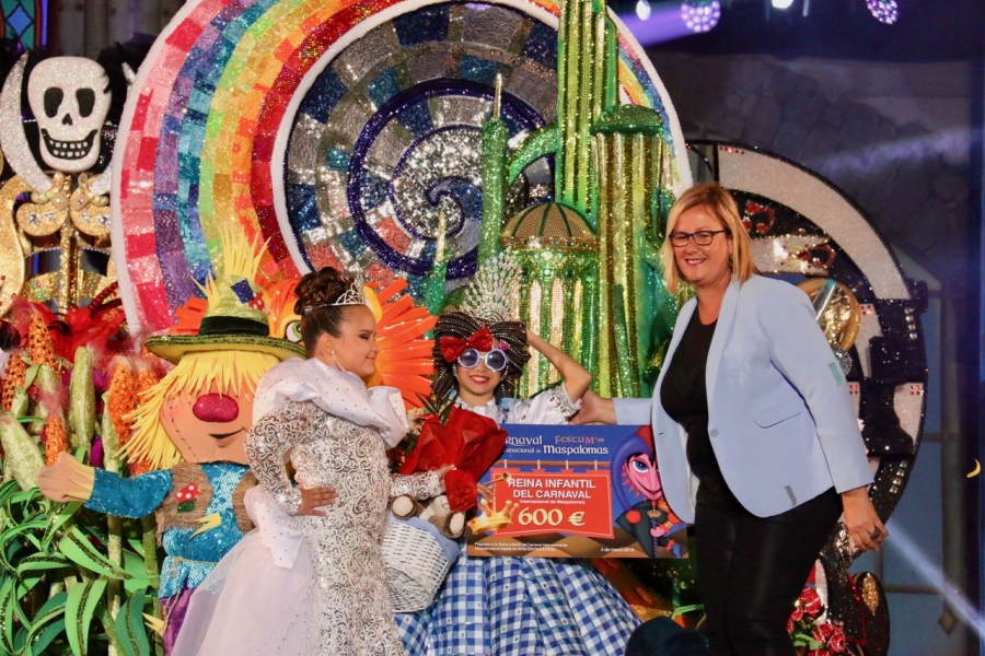La niña Náyade Pérez Castro, de 10 años, con la fantasía “Vamos al mágico mundo de…” ha conseguido en la tarde noche de este domingo el trono Infantil del Carnaval Internacional FestuM+ 2018, con un diseño de Manuel Encinoso y Begoña Pérez Quevedo, en representación de Amanda Bus.