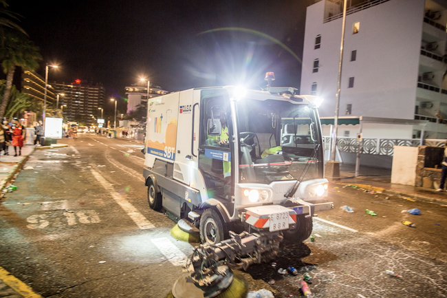 El dispositivo de limpieza postcarnaval proseguirá actuando hasta el próximo sábado con acciones de repaso y recuperación de los puntos de mayor concurrencia de Playa del Inglés, Maspalomas y San Fernando, donde se están efectuando barridos intensivos y baldeos en profundidad en los que se utilizarán unos 180.000 litros más de agua.