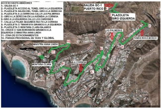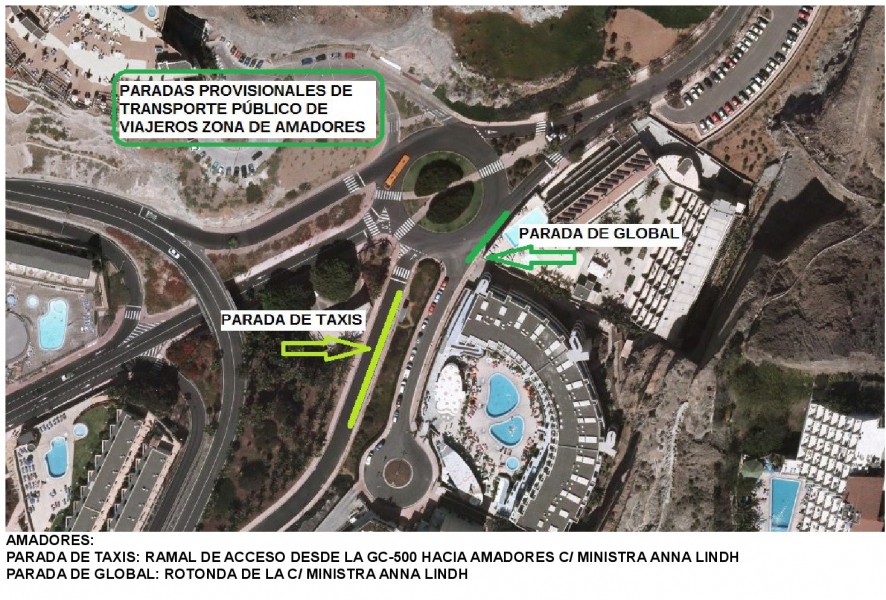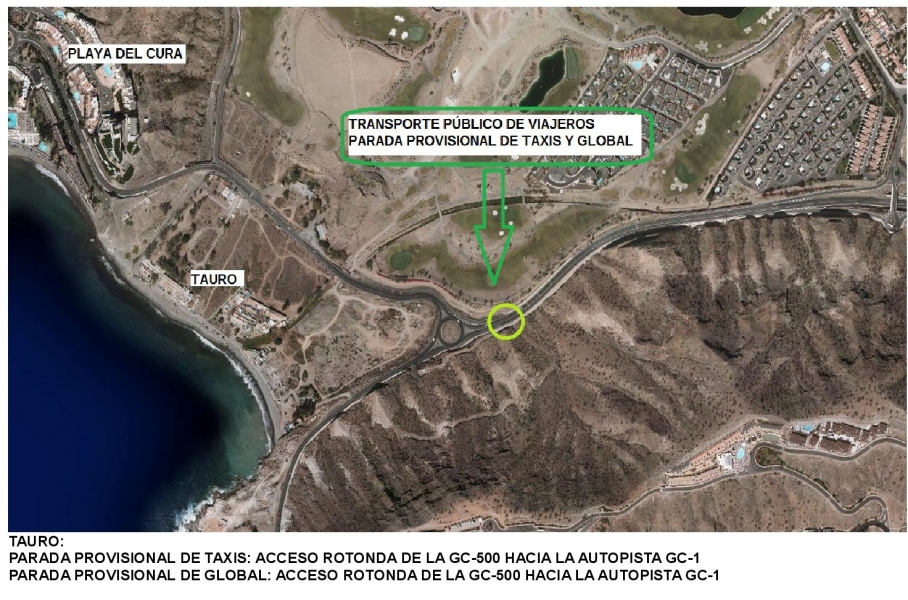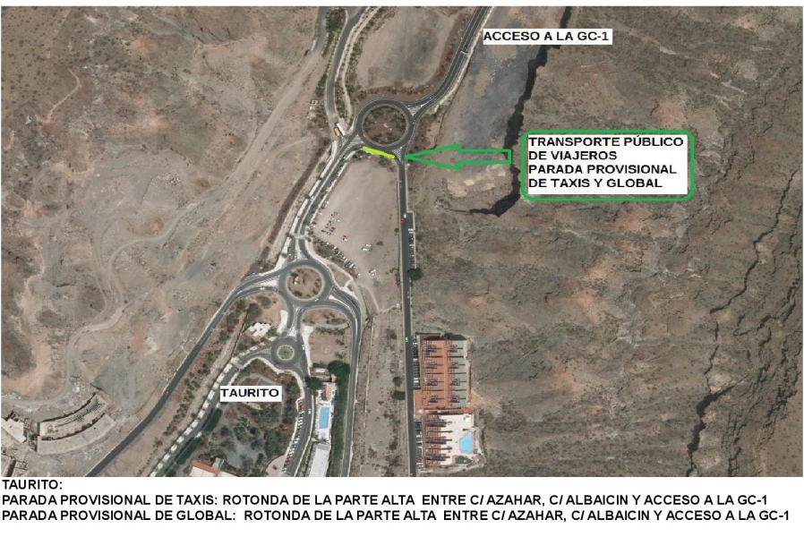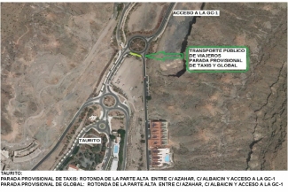 Se instalará en esta zona una parada provisional para el transporte público y taxis, en la zona del vial de acceso a la GC-500 dirección Mogán, los taxis se colocarán dirección a la avenida Ministra Anna Lindh, por donde tendrán la salida para el destino de sus clientes.
