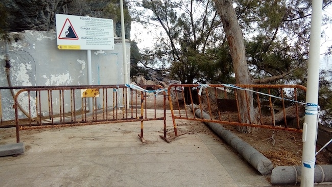 Los vecinos de San Agustín reiteran sus críticas sobre el final del paseo, a la altura de los apartamentos Balcón Canario, lugar en en que, desde hace tiempo se colocaron unas vallas para prohibir el paso a la zona rocosa. Unos carteles avisan que, lo que ocurra al pasar es responsabilidad del ciudadano, Mientras tanto sugieren la colocación de unas mallas para evitar desprendimientos y acceder a la zona con normalidad.
