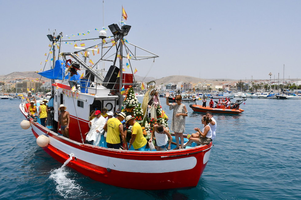 Una vez finalizada la eucaristía en la Plaza Doctor Pedro Betancor, la patrona fue trasladada a Arguineguín en la embarcación 'Como tú primero', rodeada por  barcos de pesca artesanal y por las más de cien embarcaciones de recreo que dejaron una bonita estampa frente a las puntos principales de la costa en moganera.