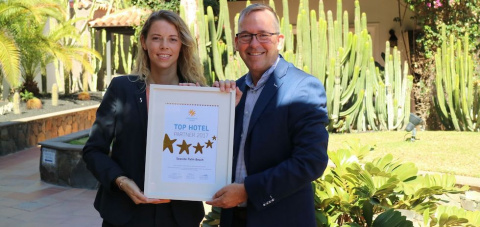 El Seaside Sandy Beach, por su lado, volvió a ganar el premio ITS Red Star Award . La entrega la hizo el Product Manager Dennis Urbschat a la directora del hotel Ursula Matas. También, junto a Los Jameos Playa se alzó con el HolidayCheck Award 2018.