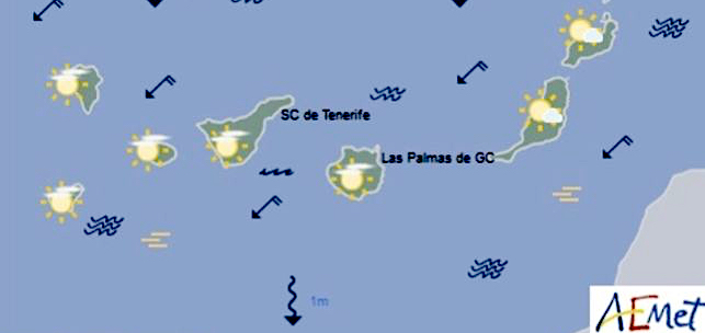 En las islas occidentales y Gran Canaria, intervalos de nubes altas, sin descartar algún intervalo de evolución en zonas de interior que podría dejar algún chubasco ocasional, principalmente en cumbres. En Lanzarote y Fuerteventura, poco nuboso o despejado. Probable calima ligera principalmente en medianías y zonas altas.