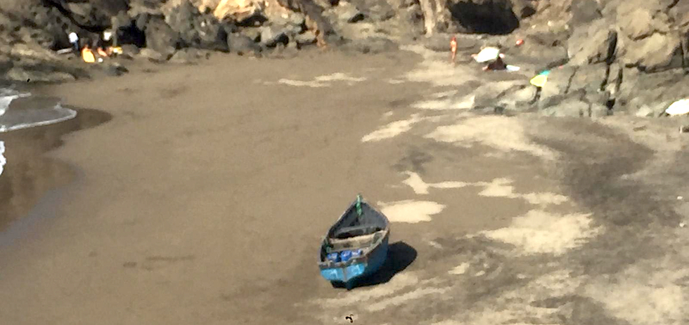 Los primeros bañistas en llegar a la Playa de Las Mujeres este sábado hallaron una patera abandonada en la orilla y avisaron a las fuerzas de seguridad y emergencias.